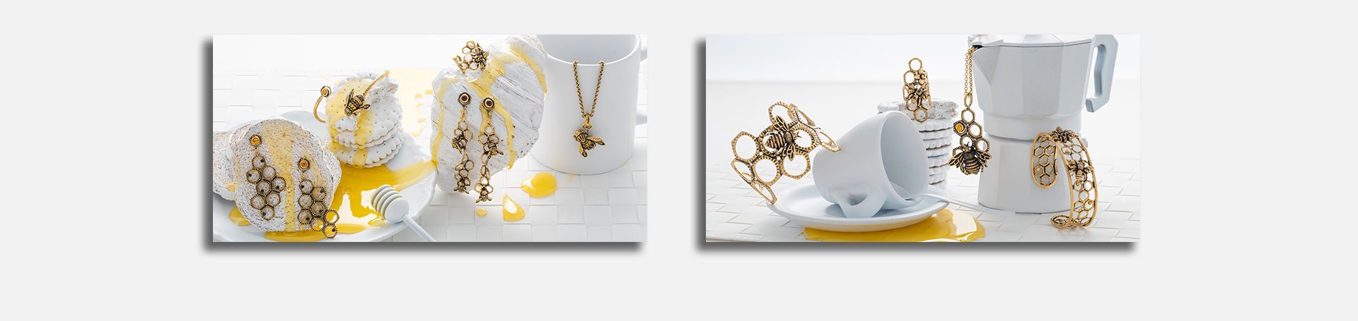 Grazie alla conoscenza delle tecniche dell'oreficeria artigiana e ad un team di designer, vengono ideate e create opere d'arte arricchite da pietre semipreziose, perle e cristalli swarovski montati su fusioni a cera persa di ottone successivamente dorato mediante bagni galvanici. Il risultato è un