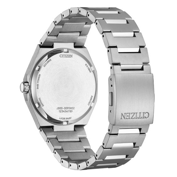 Movimento Eco Drive a carica luce con riserva di carica di 8 mesi, con indicazioni di ore, minuti, giorno, data. Caratteristiche Cassa e bracciale realizzati in titanio Grado 2 lavorato con la tecnologia esclusiva Citizen Duratect che conferisce un elevato livello di finitura estetica attraverso l’alternanza di superfici lucide e spazzolate e al tempo stesso ne incrementa la resistenza all’abrasione di oltre 5 volte rispetto all’acciaio inox. Fondo serrato a vite. Quadrante con pattern materico ispirato alla granulometria tipica del titanio. Vetro zaffiro. WR 10 bar. Dimensioni Diametro cassa: 40 mm