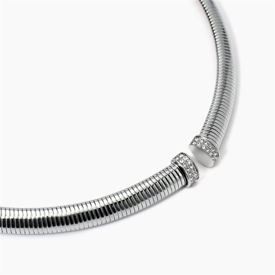 Girocollo tubogas in acciaio e cristalli Girocollo in acciaio 316L con maglia tubogas in acciaio 304 con cristalli bianchi. • Diametro interno del girocollo: 12,5 cm • Dimensione tubogas: 8 mm • Diametro cristalli: 1,25 mm • Materiale: Acciaio 316L, Acciaio 304, Cristalli