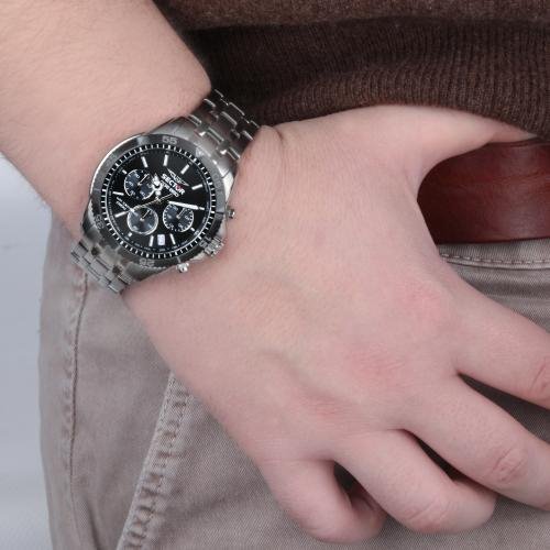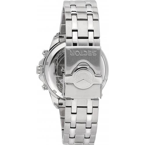 Cronografo uomo; Sector experience Challenge. Materiale e finitura cassa: Lucido e satinato; Dimensione cassa: 42 mm; Spessore cassa: 12.10 mm; cinturino in Acciaio Inox; quadrante nero; Fibbia Diver buckle w/safety lock; Vetro con Trattamento vetro zaffiro; Water resistant 10 atm; Garanzia Ufficiale 2 anni Sector; Confezione Originale Sector