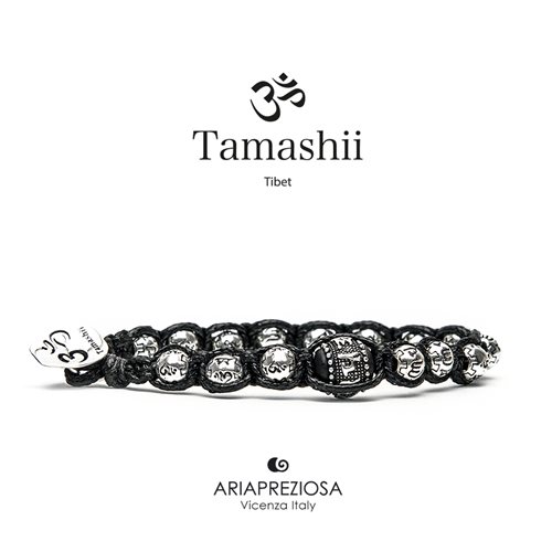 Bracciale originale in edizione limitata Tamashii 'Ruota della preghiera' arricchito da ruote a sfera in argento 925‰ incise con il mantra “Om Mani Padme Hūm” del Buddha della compassione Cenresig. Base di corda colore NERO e chiusura in argento 925‰ personalizzata con logo Tamashii. Unisex e taglia unica (il bracciale è predisposto per adattarsi a qualsiasi diametro di polso).