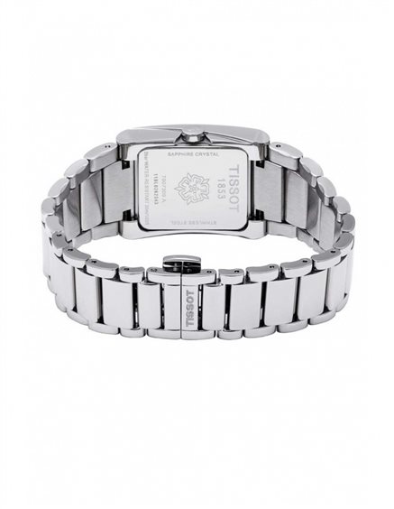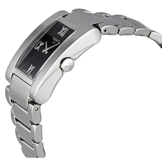 Orologio Tissot Generosi T-, donna. Cassa rettangolare 25X35mm in acciaio e cinturino in acciaio con chiusura a farfalla e pulsanti. Quadrante nero con datario a ore 3, movimento svizzero al quarzo, vetro zaffiro, impermeabile fino 3 atm. Completamente Swiss Made