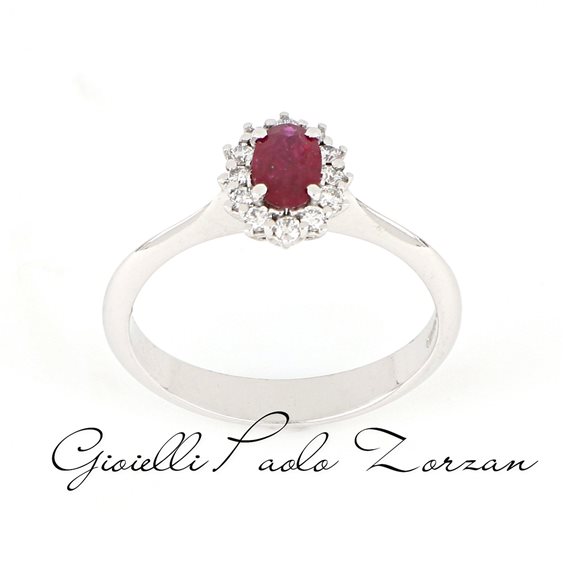 Anello in Oro 18 Kt gr. 3.10 Gemma Corindone Varietà Rubino Naturale Misure 6.00 X 4.00 mm Peso ct 0.41 Diamanti Naturali Peso ct. 0.16 Purezza SI Colore F